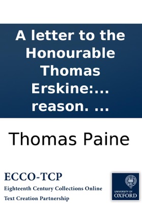 A letter to the Honourable Thomas Erskine: on the prosecution of Thomas Williams, for publishing The age of reason. ..., Thomas Paine. A letter to the Honourable Thomas Erskine: on the prosecution of Thomas Williams, for publishing The age of reason. ... Paine, Thomas, 1737-1809. 31,[1]p. ; 8⁰. Paris : printed for the author, 1797. Anonymous. By Thomas Paine. Reproduction of original from the British Library. English Short Title Catalog, ESTCT5856. Electronic data. Farmington Hills, Mich. : Thomson Gale, 2003. Page image (PNG). Digitized image of the microfilm version produced in Woodbridge, CT by Research Publications, 1982-2002 (later known as Primary Source Microfilm, an imprint of the Gale Group).