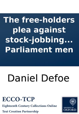 The free-holders plea against stock-jobbing elections of Parliament men, Daniel Defoe. The free-holders plea against stock-jobbing elections of Parliament men Defoe, Daniel, 1661?-1731. [4],27,[1]p. ; 4⁰. London : printed in the year, 1701. Anonymous. By Daniel Defoe. With a half-title. Reproduction of original from the British Library. Moore, 30 Goldsmiths', 3793 English Short Title Catalog, ESTCT68184. Electronic data. Farmington Hills, Mich. : Thomson Gale, 2003. Page image (PNG). Digitized image of the microfilm version produced in Woodbridge, CT by Research Publications, 1982-2002 (later known as Primary Source Microfilm, an imprint of the Gale Group).